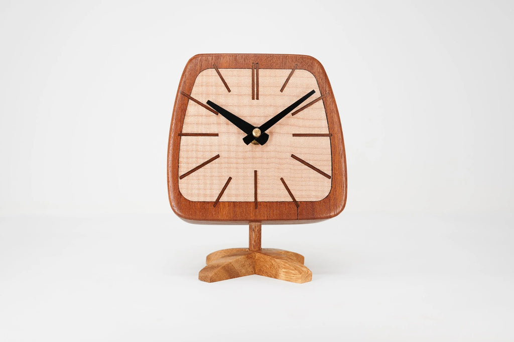 Perfect for a credenza, bookshelf, or desk, the clock stands at 6.5" tall and features a lacquer finish, precision quartz movement, and a cross-shaped pedestal base for that just-right mix of function and flair. It’s a groovy little statement piece made to elevate any modern or retro home.