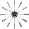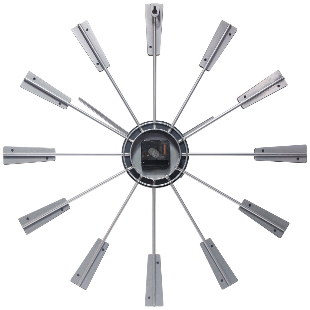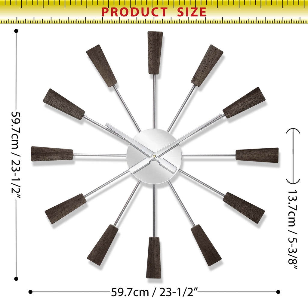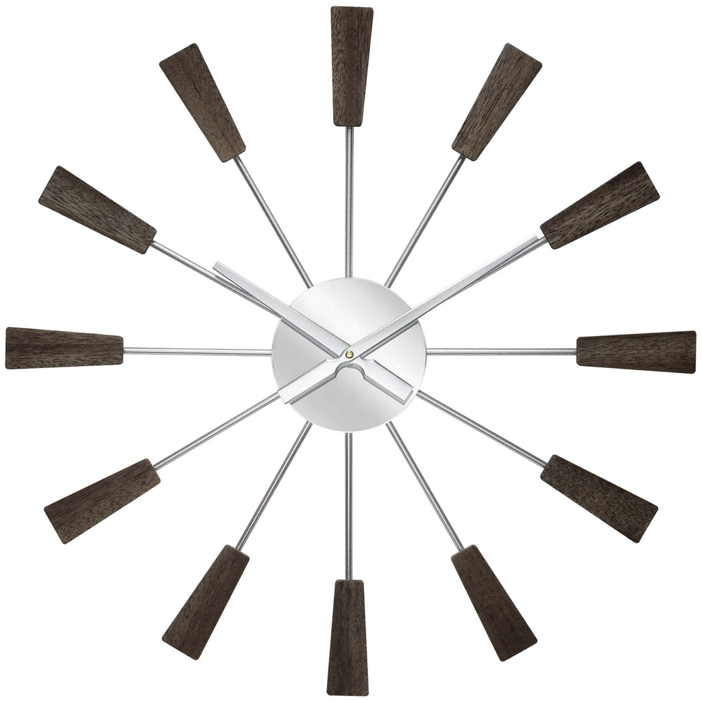 The Vinny Mid-Century Wall Clock will add vintage charm to your home. Spanning just over 23 inches, this mid-century modern inspired clock is surrounded by metal spokes with natural wood accents. The open clock face includes a mirrored center piece and matte silver metal hands. You'll love its striking and unique design no matter where it hangs in your home.
