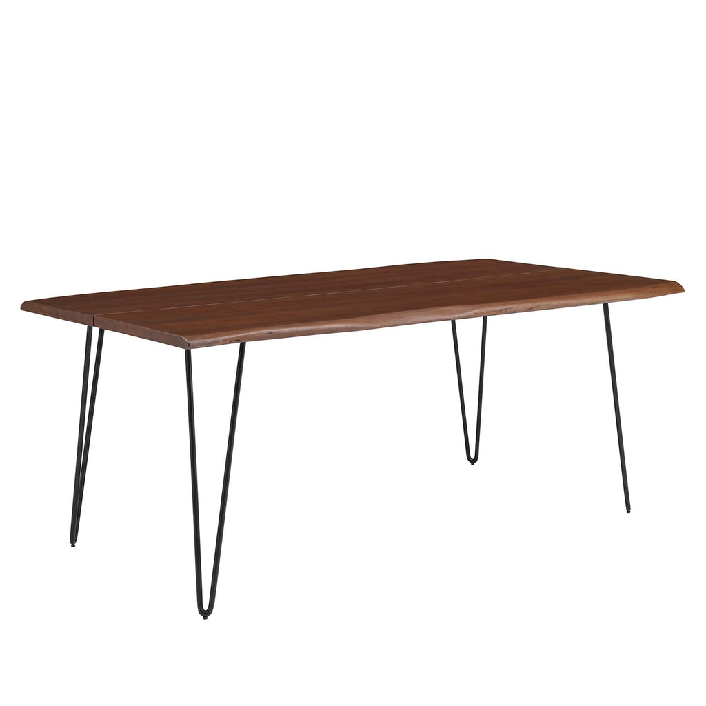 Bring natural character and sleek sophistication to your dining space with the Arlene Live Edge Dining Table. Featuring a richly grained acacia wood top with live edges and butterfly joints, each table is a one-of-a-kind piece celebrating organic beauty and mid-century craftsmanship. The minimalist silhouette is grounded with slender, powder-coated hairpin legs, available in black or gold, adding a retro-modern flair perfect for Palm Desert and Palm Springs-inspired interiors.