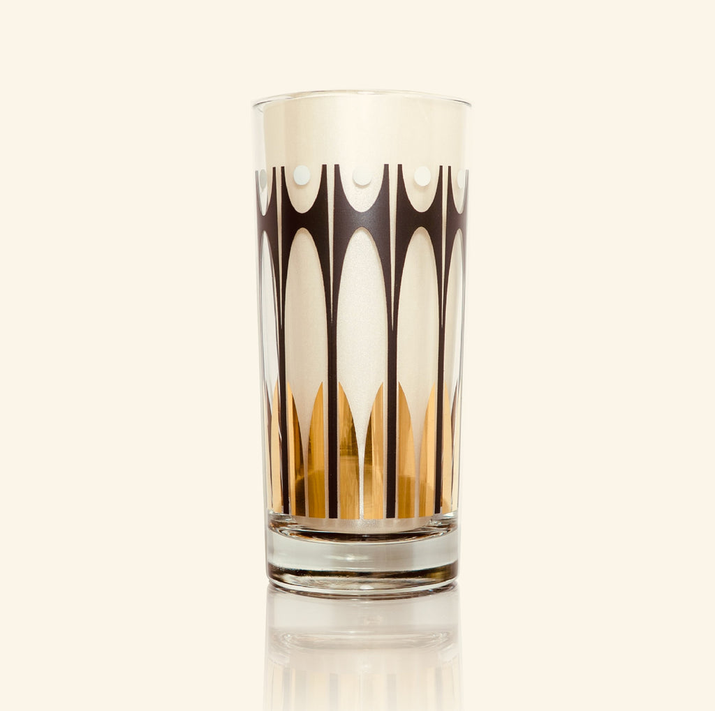 Straight outta the 1960s and into your Palm Springs or Palm Desert pad, the Umbra Beverage Glass is a retro revival masterpiece. Inspired by iconic Brasilia-style furniture, this exclusive design features deep black arches, mod white dots, and luxe 24k gold accents that shimmer with every sip. Whether you're hosting a groovy cocktail party or just want to elevate your evening seltzer, this glass is a mid-century modern marvel.